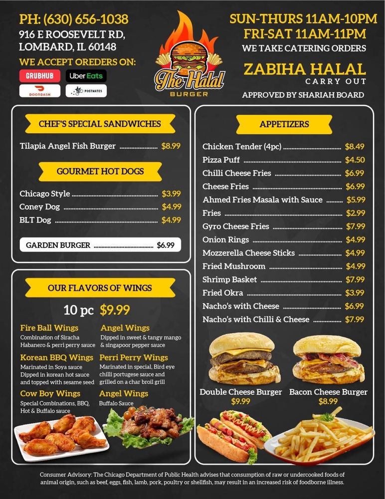 Introducing The Halal Burger, located in Lombard, IL, a hotspot for Halal hot dogs and burgers. Offering delivery and takeout, with ample parking, they cater to all taste preferences. The menu boasts a variety of appetizers like Chilli Cheese Fries, Chicken Nuggets, and Nachos, all at reasonable prices. The Deli Style Sandwiches, including Turkey Swiss and Beefy Roast Beef, are popular choices. Customer reviews rave about the Fireball Burger, juicy and flavorful with a unique secret sauce, and the generous portions at great value. The welcoming atmosphere and friendly staff add to the delightful dining experience. With Zabiha Halal meat options, The Halal Burger is a must-visit for all burger enthusiasts looking for a delicious and satisfying meal.